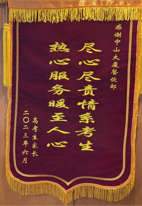 “盡心盡責情系考生,熱心服務暖至人心”--金燦燦的大字在紅彤彤的錦旗上格外引人注目。七月初,餐飲部收到了一面由高考家長送來的錦旗,以此表達他們對中山大廈工作人員盡職盡責、溫暖服務的感謝。