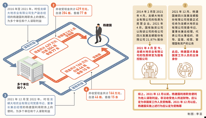 受賄罪。2021年4月,四川發(fā)展礦業(yè)集團有限公司(國有獨資公司)認購四川發(fā)展龍蟒股份有限公司21.87%股份,成為第一大股東。四川發(fā)展龍蟒股份有限公司的性質(zhì)轉變?yōu)閲锌毓晒?。龍蟒大地公司作為四川發(fā)展龍蟒股份有限公司的全資子公司,其性質(zhì)也隨之轉變?yōu)閲锌毓晒尽?021年12月,楊建國被四川發(fā)展龍蟒股份有限公司黨委正式任命為龍蟒大地公司黨委書記、董事長兼總經(jīng)理。2021年12月至2022年,楊建國利用職務上的便利,為多個單位和個人在工程建設項目承攬、工程款撥付等方面提供幫助,非法收受他人所送現(xiàn)金共計166萬元、白酒46瓶、香煙15條。