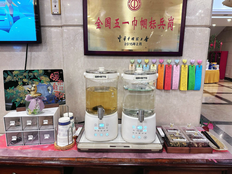 暖茶自取功能。配備了2個(gè)大保溫壺,一個(gè)提供茶飲,一個(gè)常備熱水,旁邊4個(gè)精美的玻璃罐內(nèi)備有胎菊,紅棗干,檸檬片,金邊玫瑰,賓客隨喜好夾取,泡飲。